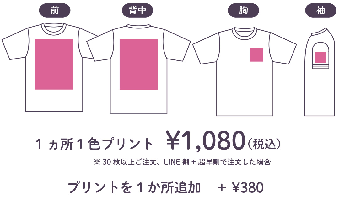 以下の場合、別途お見積りになります。 ・10枚~29枚の場合 ・単色ではない背ネームをご利用の場合 ・プリントする色数が2色以上になる場合 ・特色インク(グリッターやゴールド、シルバー)をご希望の場合 ・プリント内容が1カ所1色プリントでない場合 ・ご注文からお届けまで、29日~10日前の場合、プリント一カ所一色につき+100円になります ※10日~1日前は別途お見積りになります